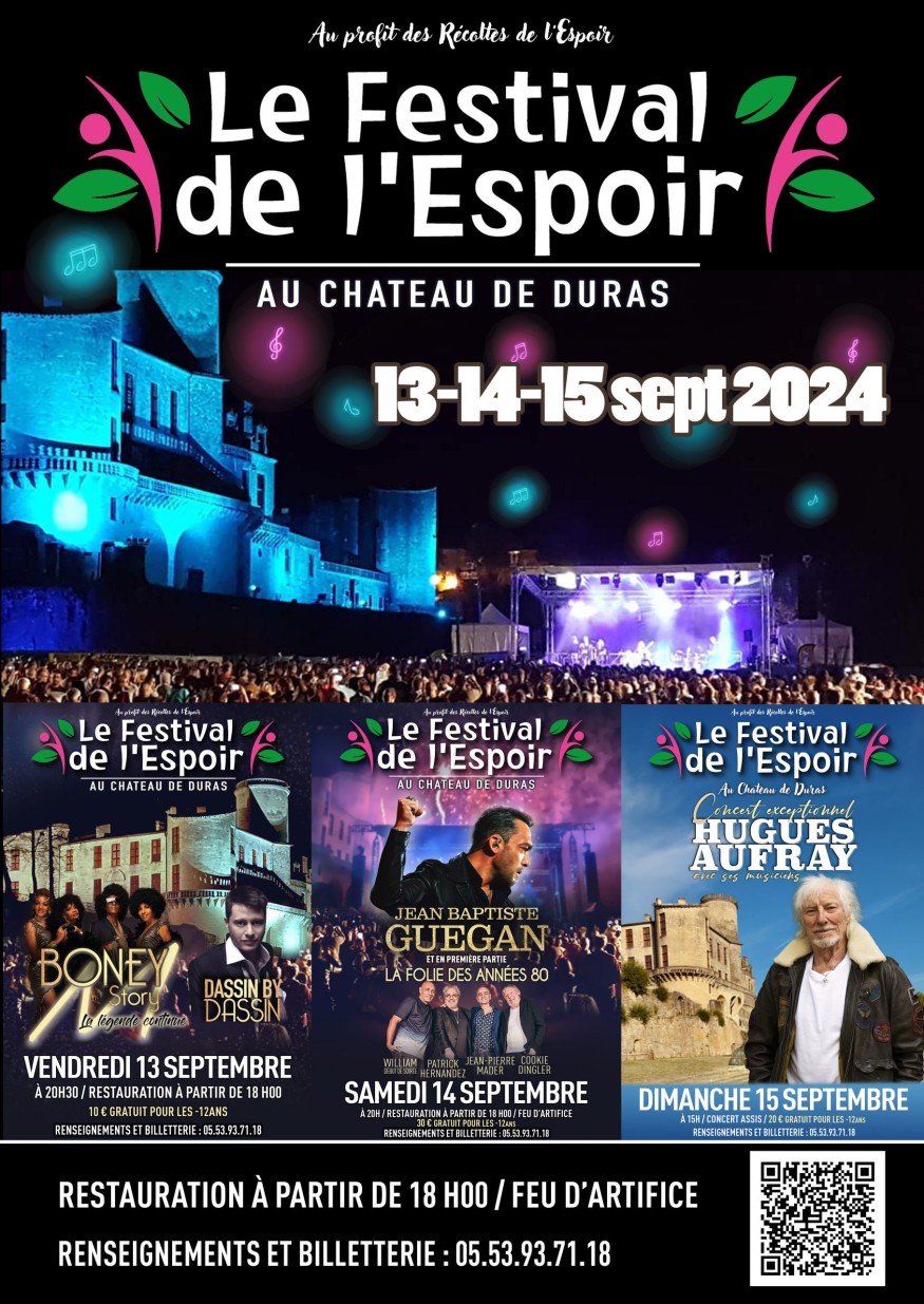 "Le Festival de l'Espoir 2024" avec l'Association "Les récoltes de l'Espoir" mobilisé pour les enfants malades fête cette année ses 10 ans d’engagement avec ses bénévoles les 13,14 et 15 septembre 2024 avec un programme inédit sur le site du chateau de DURAS (47)