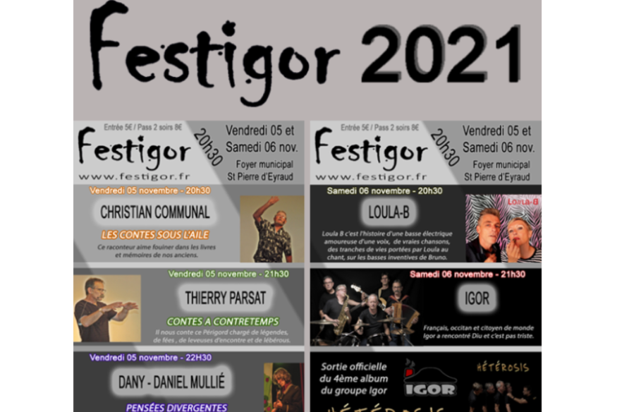 Vendredi 05 novembre: Christian Communal (conteur qui aime fouiner dans les livres et mémoires de nos anciens), Thierry Parsat (contes à contretemps : contes du P2rigord chargé de légendes), Dany - Daniel Mullié ( Pensées divergentes: création unique pour le Festigor) à 20h30.