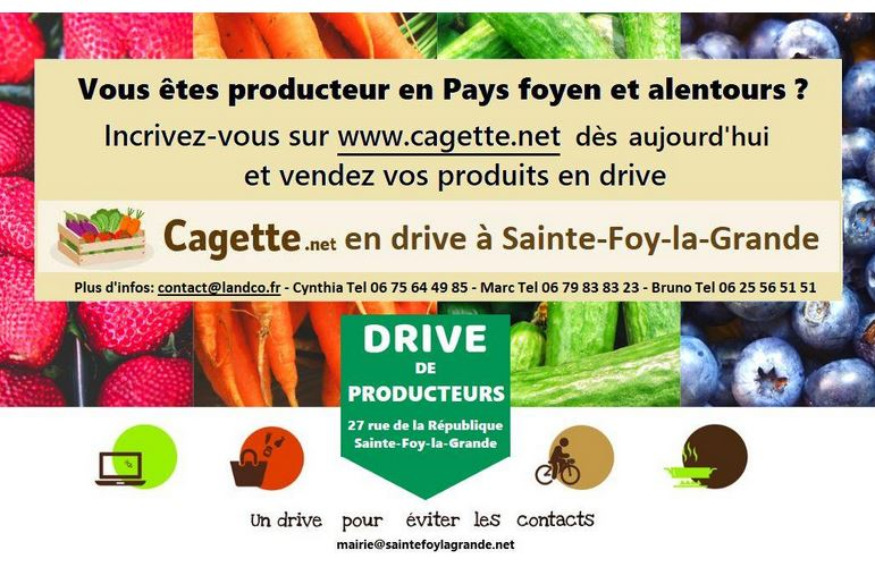 Producteurs, maraîchers, éleveurs, continuez à approvisionner Sainte-Foy-la-Grande avec le "Drive producteurs" qui sera prochainement ouvert en centre-ville dans un partenariat organisé entre la mairie de Sainte-Foy-La-Grande et les associations et grâce aux bénévoles mobilisés, 27 rue de la République. Face à l’urgence, aucun frais d'inscription et accès immédiat aux producteurs qui souhaitent rejoindre le programme sur: https://app.cagette.net/p/pro/signup