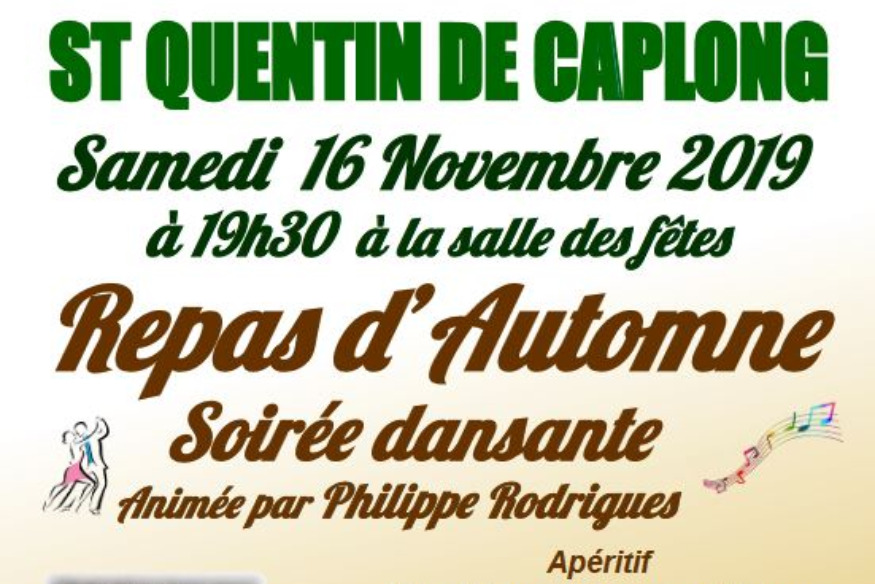 L'association Saint-Quentin Loisirs vous propose un savoureux repas d'automne. Cette animation consistera en une soirée dansante. Il convient d'apporter ses couverts (assiette à soupe comprise).Un moment de convivialité à partager!Rendez-vous salle des fêtes de ST QUENTIN DE CAPLONG à 19h.
