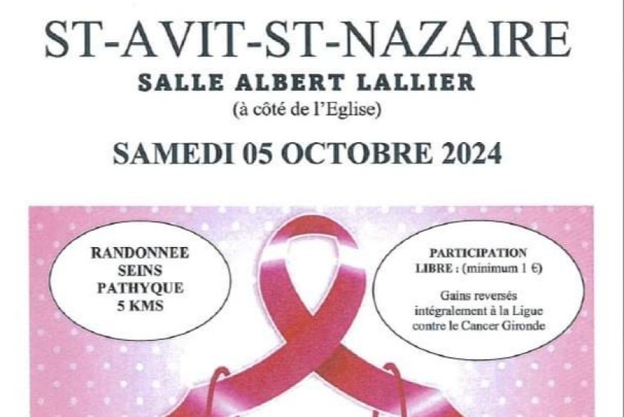 Le Centre Communal d'Action Social de SAINT AVIT SAINT NAZAIRE se mobile à nouveau contre le cancer du sein le Samedi 05 Octobre 2024 en organisant une randonnée pédestre de 5km en Rose depuis la salle Albert Lallier près de l'église.