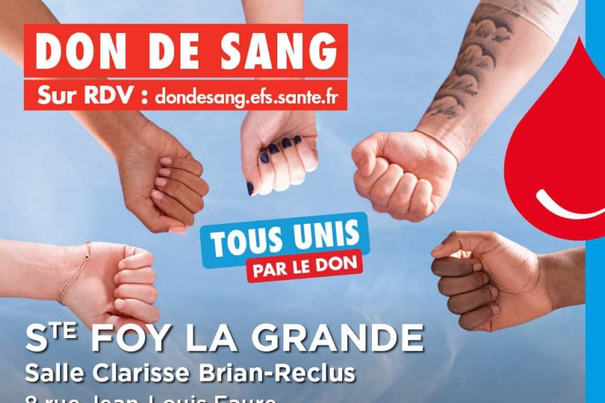 L’Association des donneurs de sang bénévoles du Pays foyen, en partenariat avec l’Établissement français du sang (EFS), organise une collecte ce mercredi 26 Juin 2024 de 15 à 18h30 heures, salle Clarisse-Brian de STE FOY LA GRANDE. Comme chaque été les réserves sont très basses et pour les malades il est impotant que les donneurs se mobilisent. Réservez en ligne votre rendez-vous sur dondesang.efs.sante.fr