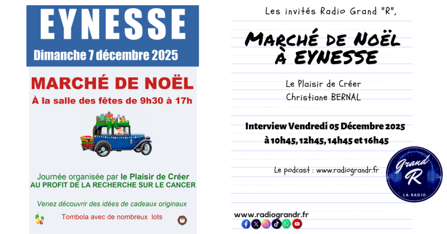 Christiane BERNAL la présidente de l'association "Le Plaisir de créer" revient pour nous sur le marché de Noël solidaire à EYNNESSE au micro de Radio Grand "R" !