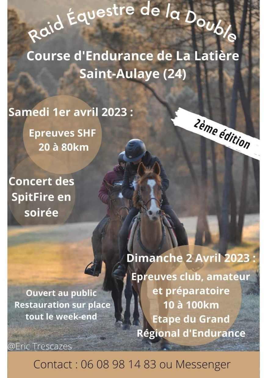 Ainsi, les valeurs véhiculées par l’endurance sont le dépassement de soi, la complicité et le partage de l’effort avec son cheval, le partage et l’entraide avec les autres cavaliers et assistants, la possibilité d’évoluer en pleine nature et la prise de conscience de la fragilité des écosystèmes. Passionnés par cette discipline, nous organisons notre 2ème édition les 1er et 2 avril 2023 sur le site de la Latière à Saint-Aulaye (24). Les concurrents traverseront les communes de Saint Aulaye, Echourgnac, La Jemaye et Saint Vincent-Jalmoutiers.