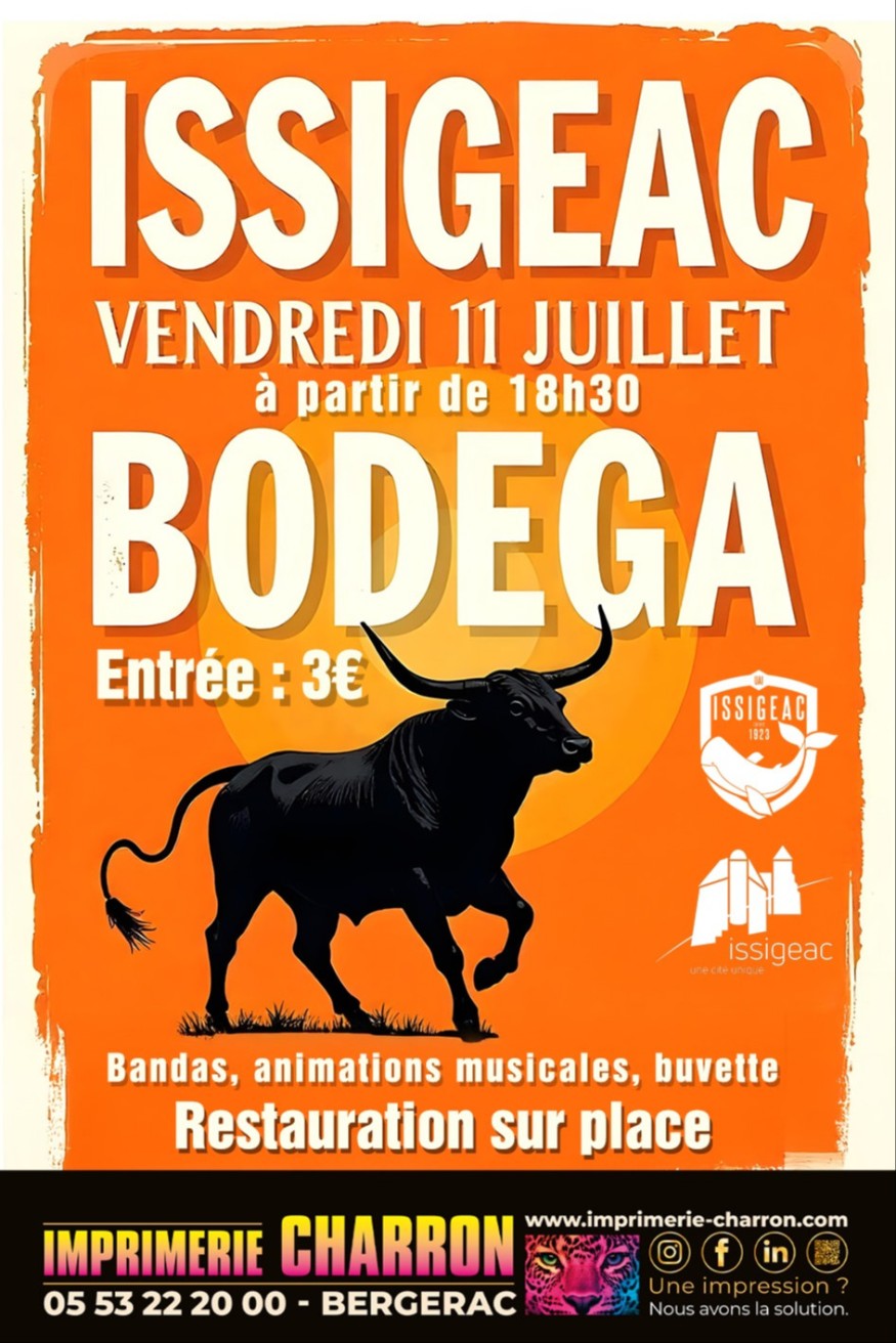 Dans le cadre des festivités de l’été, l’Union Athlétique Issigeacoise organise la Bodéga à Issigeac le vendredi 11 juillet 2025 à partir de 18 H 30. Le prix de l’entrée est fixé à 3 €. La soirée sera animée par les Bandas du "Trèfle Gardonnais", "des Bleuets" de Saint Pierre d’Eyraud, le DJ Disquo-Equalizer et le groupe Terry et Sussie. Ambiance garantie pour une soirée d’été de folie !
