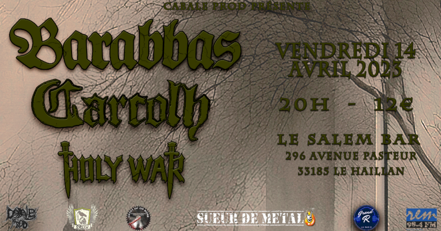 Arch Gros Barbare et Smooky ainsi que le staff agrandi pour l’occasion, vous accueillent pour cette soirée si particulière pour nous en vous proposant les groupes : CARCOLH – HOLY WAR – BARABBAS. (dont deux groupes signés chez https://sleepingchurchrds.com/fr/