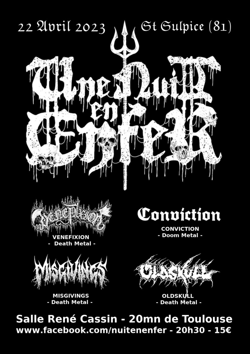 Donc, nous allons vous parler de cette belle soirée d' Une Nuit en Enfer et quelle soirée car il s'agit des 20 ans d'existence et c'est la 14° édition. Pour cela, vous aurez droit à du OLDSKULL – MISGIVINGS – CONVICTION – VENEFIXION.