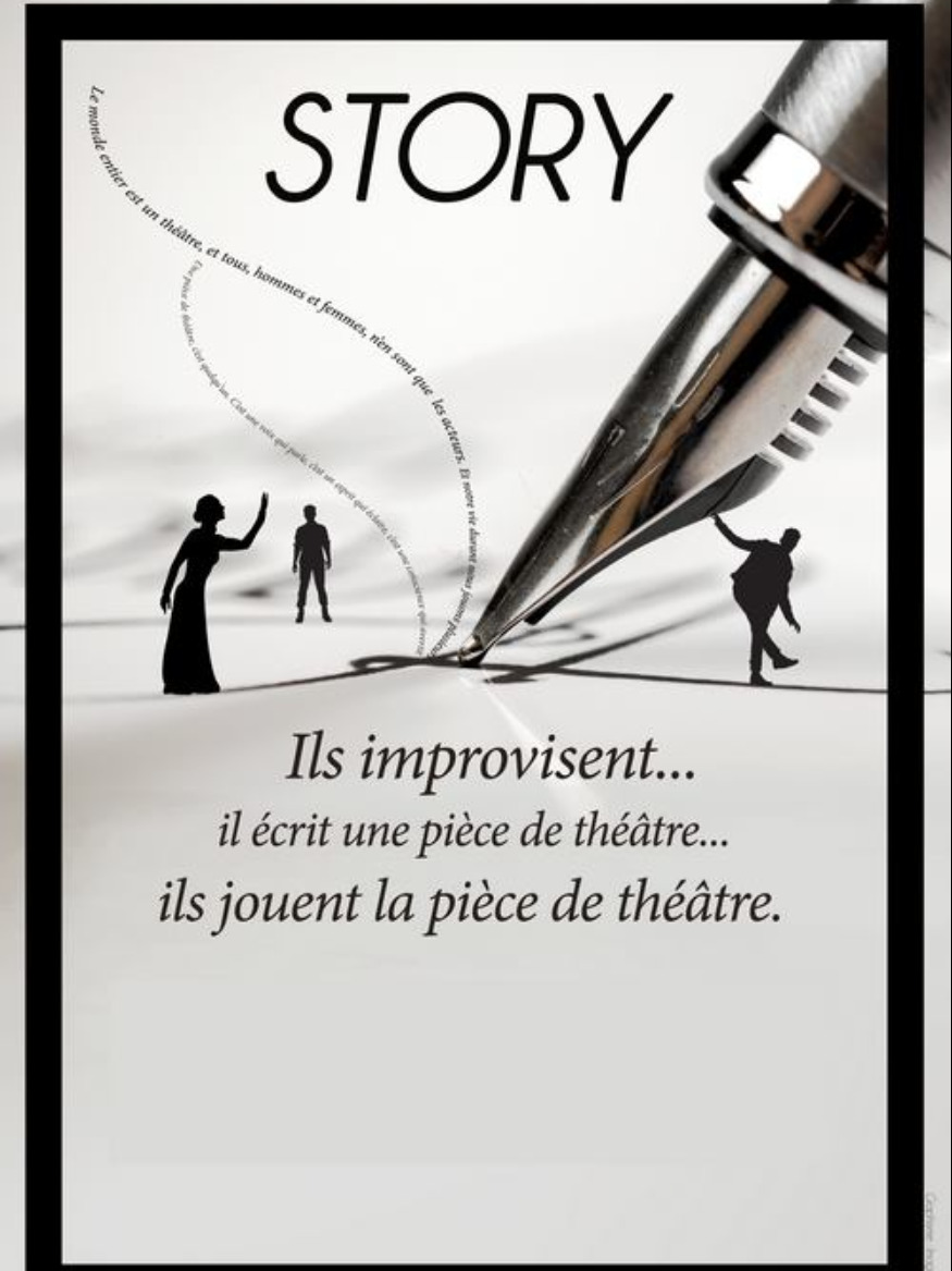 Story vous propose d'assister à la création d'une pièce de théâtre, de son écriture à sa représentation finale. A partir de plusieurs improvisations jouées par des comédiens, un Maître d'écriture sélectionne plusieurs éléments de ces improvisations pour écrire en direct la trame d'une pièce de théâtre qui sera ensuite jouée par les comédiens et les comédiennes (dialogues improvisés).