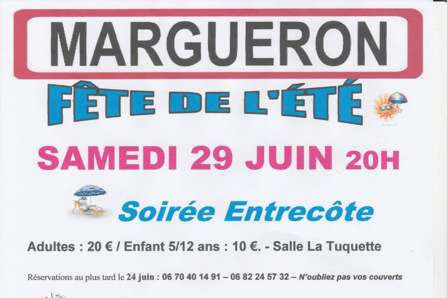 La commune de MARGUERON fête l'été durant 2 jours. Samedi 29 Juin soirée entrecôte avec "Fantic Music" à 20h. Dimanche 30 Juin à 10h animations pour tous avec la Banda "les durs à cuire".