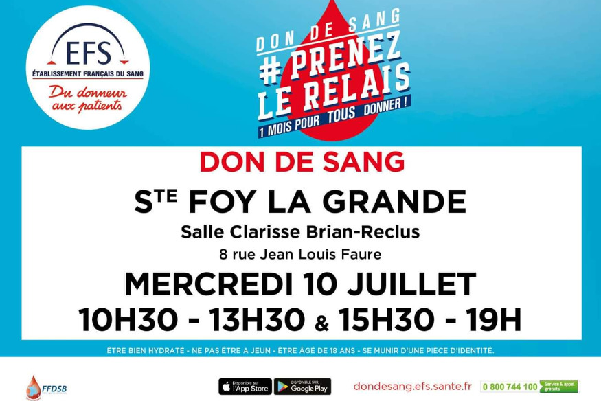 L'établissement du sang (EFS) atire depuis plusieurs semaines l'attention des citoyens sur l'imporance de donner son sang pour garantir un niveau suffisant des stocks sanguins durant tout l'été et sur la route des vacances. Rendez-vous ce mercredi 10 Juillet à STE FOY LA GRANDE entre 10h30/13h30 et 15h30/19h30 à la salle Clarisse Briand.