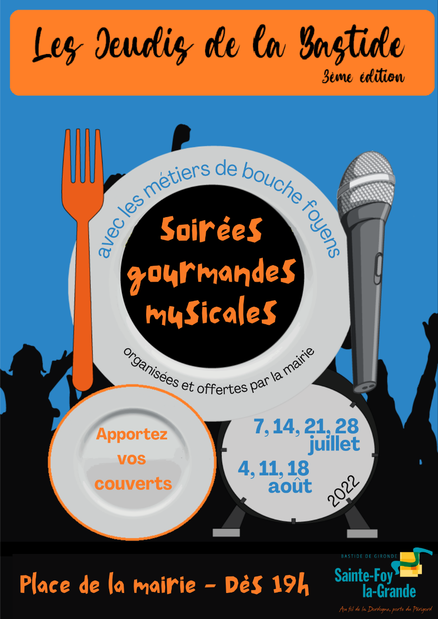 Les JEUDIS DE LA BASTIDE sont de retour cet été avec des soirées gourmandes et musicales, sur la place de la mairie de Sainte-Foy-la-Grande, de 19h à 23h environ. Pour l’occasion, les métiers de bouche de la bastide sont conviés à cuisiner sur place. Quelques producteurs des alentours se joignent à la manifestation pour compléter l’offre en cas de besoin. De la sorte, le public peut composer son menu selon son budget et ses envies, puis s’installer librement sur les tables et chaises dressées par la commune.