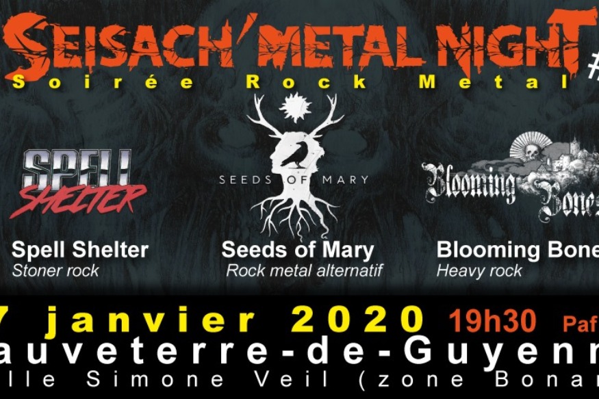 Première "Seisach' Metal Night"Soirée spéciale Rock Metal avec, en headliners, les Seeds of Mary (rock metal alternatif) facebook.com/SeedsOfMary/ Ils seront accompagnés des Spell Shelter (stoner) facebook.com/spellshelteret des Blooming Bones (heavy rock)facebook.com/bloomingbones/En partenariat avec le webzine COREandCO facebook.com/coreandco/Partenaire promo Web : Réseau de France Metal AssoPAF (sur place) : 6 eurosPossibilité de covoiturage : voir publication dédiée sur facebook.com/Seisachtheion