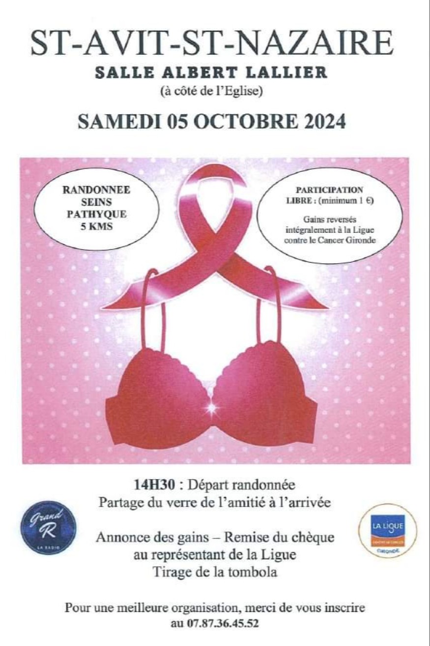 Le Centre Communal d'Action Social de SAINT AVIT SAINT NAZAIRE se mobile à nouveau contre le cancer du sein le Samedi 05 Octobre 2024 en organisant une randonnée pédestre de 5km en Rose depuis la salle Albert Lallier près de l'église.