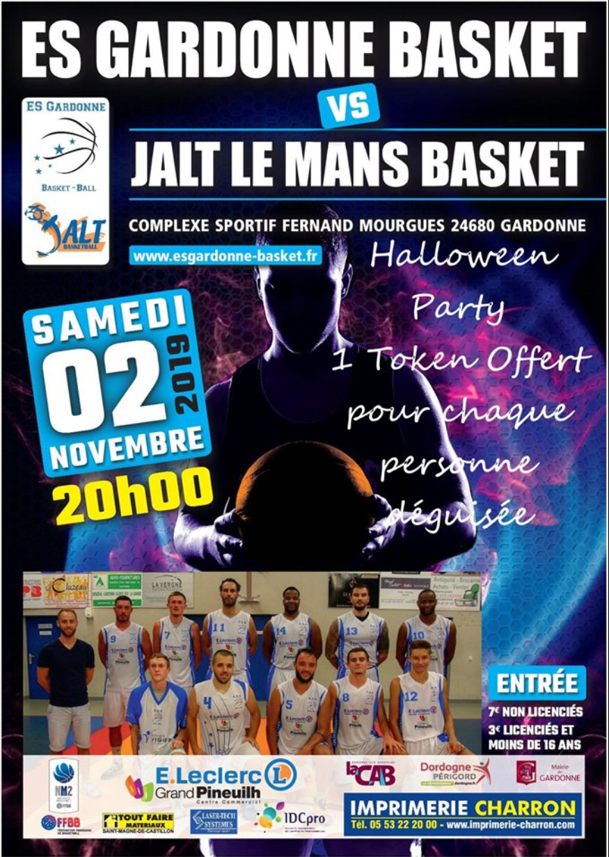 Ce samedi 02 Novembre à 20h00, L'ES GARDONNE Basket rencontre JALT LE MANS au complexe Fernand MOURGUES à GARDONNE. A cette occasion, pour chaque personne déguisée à l'entrée, un token vous sera offert pour soit prendre une boisson ou un sandwich. Ambiance assurée..