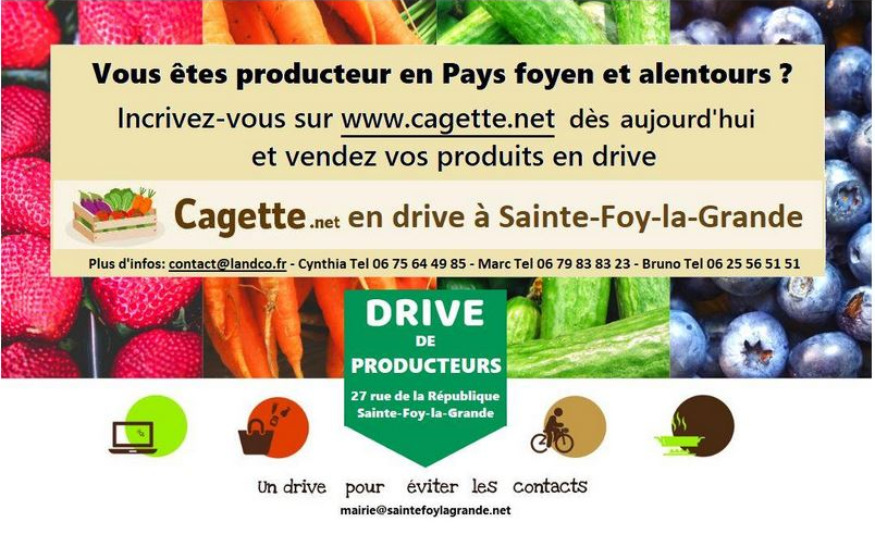 Producteurs, maraîchers, éleveurs, continuez à approvisionner Sainte-Foy-la-Grande avec le "Drive producteurs" qui sera prochainement ouvert en centre-ville dans un partenariat organisé entre la mairie de Sainte-Foy-La-Grande et les associations et grâce aux bénévoles mobilisés, 27 rue de la République. Face à l’urgence, aucun frais d'inscription et accès immédiat aux producteurs qui souhaitent rejoindre le programme sur: https://app.cagette.net/p/pro/signup