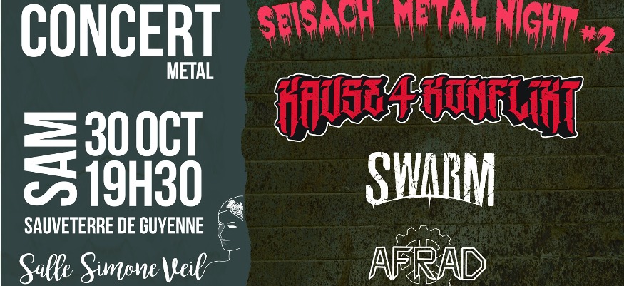 Dans cette petite commune de Sauveterre de Guyenne (Gironde), petite bastide médiévale où il fait bon vivre, avec un complexe pour les concerts vraiment très bien , c'est le samedi 30 octobre 2021 à 19h30 que la seconde édition de la Seisach aura lieu. Pas très loin de Bordeaux et de Langon à mi chemin entre le Mordor et la Comté, en venant de Mont de marsan, d'Agen ou de Ste Foy La Grande, c'est un havre de paix qui l'espace d'un soir, prendra des allures de purgatoire avec trois groupes teintés core.