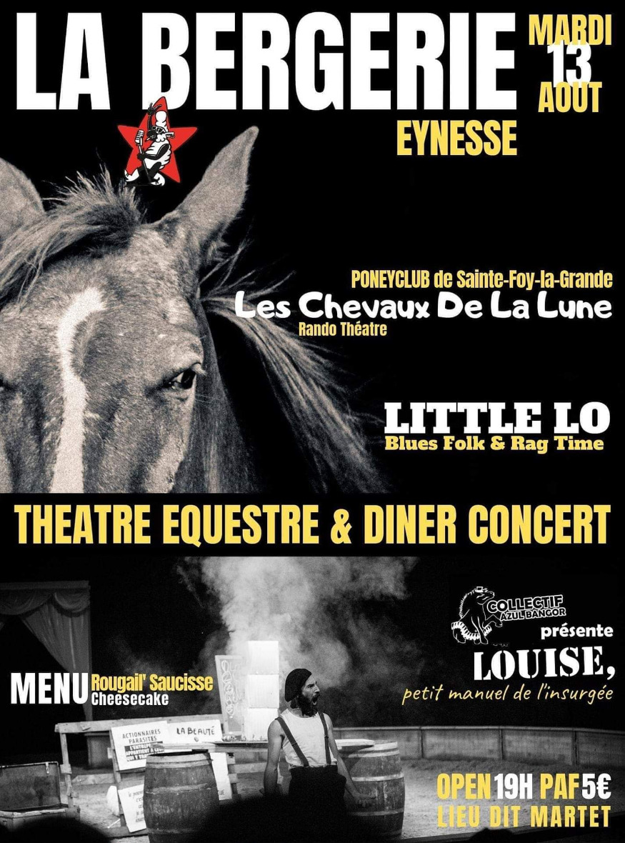 Mardi 13 Août 2019 concert blues et théâtre équestre à la Bergerie d'Eynesse en Pays Foyen. Sur scène, pendant le dîner, Little Lo nous jouera ses notes de blues, la compagnie de théâtre équestre estivale du Poney Club Ste Foy nous jouera une pièce amateur écrite par Danielle Lacombe et intitulée Les "Chevaux de La Lune", et pour finir, la compagnie professionnelle Collectif Azul Bangor clôturera la soirée avec sa pièce incontournable "Louise, petit manuel de l'insurgée".