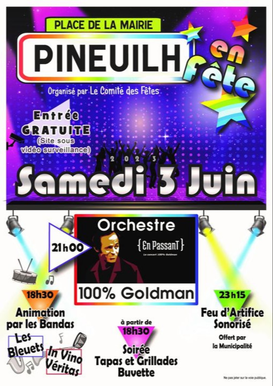 À l'occasion de la fête locale, le Comité des fêtes de Pineuilh prépare activement les festivités du samedi 03 Juin 2023 prochain sur la place de la mairie. Au programme Bandas avec les "Les Bleuets" et "In vino", soirée spectacle avec un orchestre "100 % Goldman", soirée tapas et grillades, feux d'artifices sonorisés.