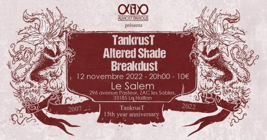 Au menu ce soir, entrée, plat et dessert à l’iconique Salem pour les 15 ans d’existence de TANKRUST, groupe de Thrash Death HxC de la capitale. Ils seront accompagnés des locaux Death Thrashers ALTERED SHADE et BREAKDUST. Je serai accompagné pour l’occasion de Papaours, sorti de sa grotte avant une hibernation prolongée et du Cousin, qu’on peut admirer derrière son appareil photo. Le temps du trajet pour écouter un dernier heavy riche en voix claires puisque clairement je n’aurai pas l’occasion d’en entendre lors des prochaines heures et me voilà au Salem.
