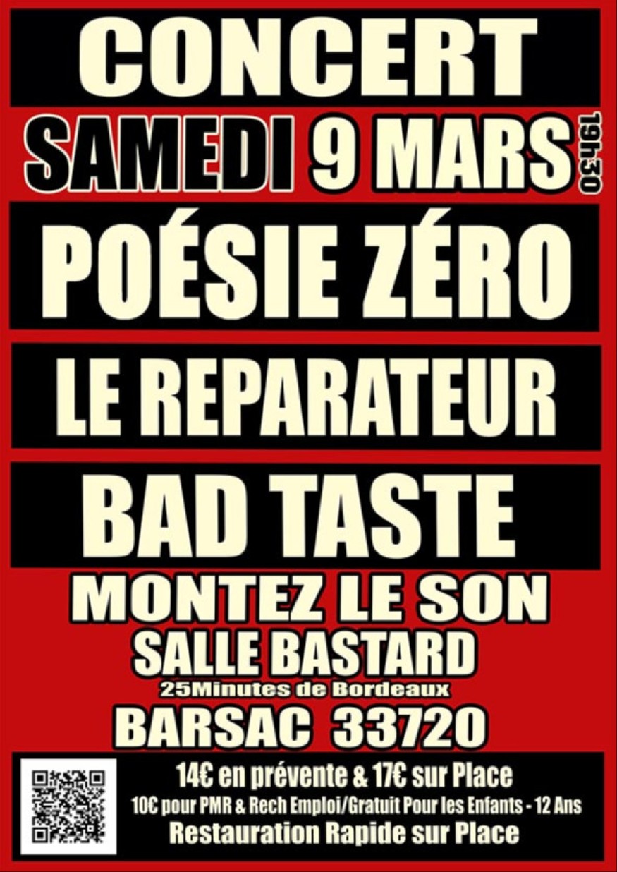 Samedi 9 mars, on retrouvera sur la scène Bastard trois groupes connus : Poésie Zéro, Le Réparateur et les Agenais Bad Taste. Les premiers ont notamment joué sur la Warzone du célèbre Hellfest l’été dernier ce qui a fait monter leur notoriété. C’est donc un privilège de les recevoir à Barsac ce samedi où l’ambiance sera électrique.