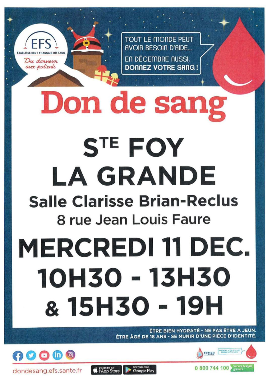 L'établissement du sang (EFS) atire l'attention des citoyens sur l'imporance de donner son sang pour garantir un niveau suffisant des stocks sanguins. Rendez-vous ce mercredi 11 Décembre 2019 à STE FOY LA GRANDE entre 10h30-13h30 et 15h30-19h00 à la salle Clarisse Briand.