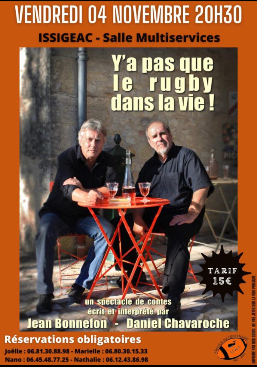 Dans un premier temps l'amicale du centenaire de l'U.A.I organise une soirée contes à 2 voix (Jean Bonnefon et Daniel Chavaroche) autour du rugby "Y a pas que le rugby dans la vie" le vendredi 4 novembre 2022 à 20h30 dans la salle multi activités d'Issigeac.