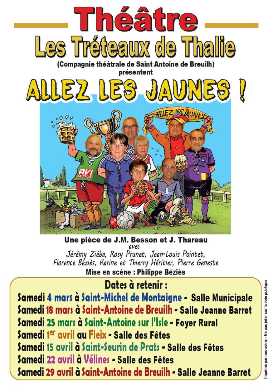 Après deux années d’absence, la compagnie théâtrale "Les Tréteaux de Thalie" se produira samedi 18 mars à 20 h 45 à la salle Jeanne Baret de Saint Antoine de Breuilh avec une comédie en trois actes de Jean-Michel Bes- son et Jacques Thareau : « Allez les jaunes ! ». Elle sera interprétée par Jean Louis Pointet, Florence Béziès, Jérémy Ziéba, Karine Héritier, Roseline Prunet, Thierry Héritier et Pierre Geneste sur une mise en scène de Philippe Béziès. L'histoire ; Jacky, mari de Véronique, a décidé de se rendre au rendez-vous qu’il a obtenu de la femme du boucher. À chaque tentative d’évasion du domicile conjugal, Véronique ou un événement intervient, l’en empêchant. On verra ainsi évoluer à chaque minute une situation désopilante. Avec le copain Fernand et son ami Popaul qui ont commencé par arroser, avant le match, la victoire de l’équipe de football dont ils sont supporters. La compagnie se produira également samedi 25 mars à Saint Antoine-sur-l’Isle (33), samedi 1er avril au Fleix, samedi 15 avril à Saint-Seurin-de-Prats, samedi 22 avril à Vélines et samedi 29 avril à Saint Antoine de Breuilh.