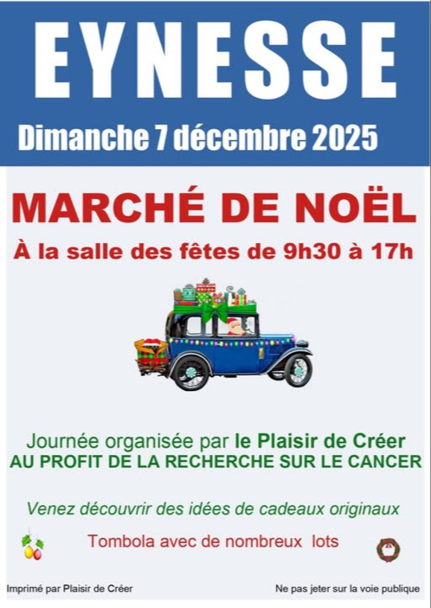 Dimanche 7 décembre 2025, l'association "le Plaisir de créer" organise son marché de Noël de 9 h 30 à 17 heures, à la salle des fêtes d'Eynesse. Plusieurs stands seront installés et le public pourra y découvrir des créations artisanales, des objets en bois, en verre et en métal décorés ainsi que des coussins. Les visisteurs pourront également trouver d'autres exposants avec des décorations de Noël, du cartonnage, du linge brodé, des produits de beauté, des bijoux et des produits locaux. Tous les articles seront vendus au profit de la recherche contre le cancer de l'Institut Bergonié, centre régional de lutte contre le cancer de Bordeaux. Petite restauration sur place avec une tombola dotée de nombreux lots sera aussi proposée. Pour plus d’informations au 06 86 52 05 27 et par mail : Plaisir.de.creer@free.fr