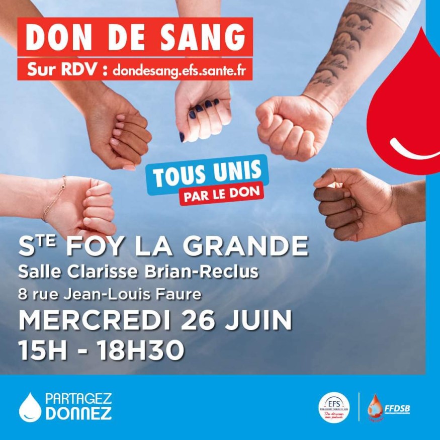 L’Association des donneurs de sang bénévoles du Pays foyen, en partenariat avec l’Établissement français du sang (EFS), organise une collecte ce mercredi 26 Juin 2024 de 15 à 18h30 heures, salle Clarisse-Brian de STE FOY LA GRANDE. Comme chaque été les réserves sont très basses et pour les malades il est impotant que les donneurs se mobilisent. Réservez en ligne votre rendez-vous sur dondesang.efs.sante.fr