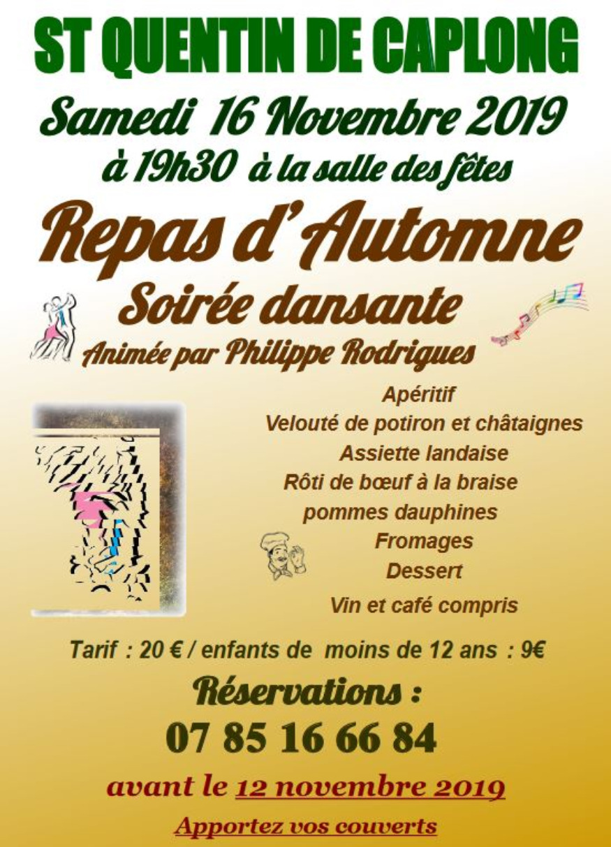 L'association Saint-Quentin Loisirs vous propose un savoureux repas d'automne. Cette animation consistera en une soirée dansante. Il convient d'apporter ses couverts (assiette à soupe comprise).