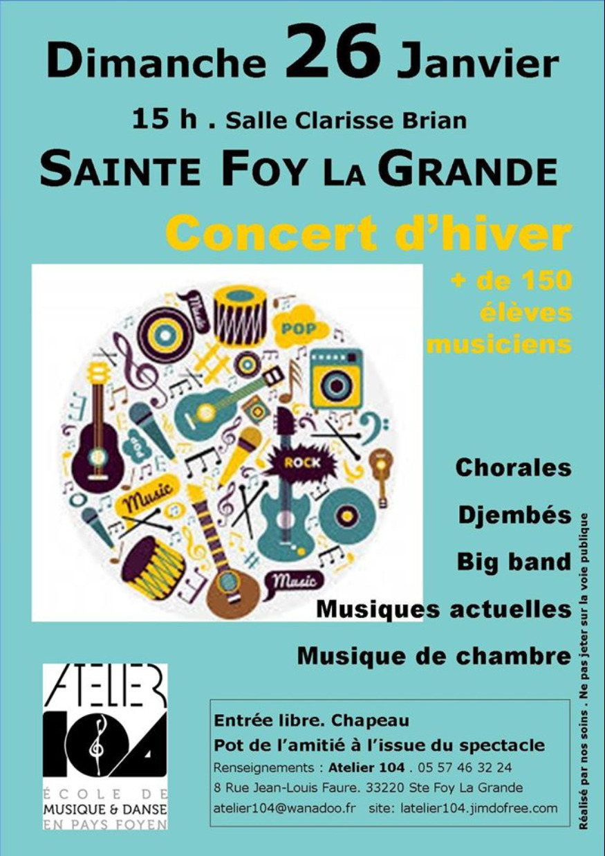 Dimanche 26 Janvier, à 15h, la salle Clarisse Brian de Sante Foy La Grande résonnera des notes des élèves de l’Atelier 104, école de musique et de danse en Pays Foyen. Chorales et orchestres divers se partageront la scène à travers un programme éclectique : loin de l’ image des écoles de musique traditionnelles, les choix artistiques de l’équipe pédagogique font la part belle à la musique classique, bien sûr, mais également à la chanson française, au jazz, à la Pop, au Rock, ,aux percussions … Un moment de qualité et de convivialité , en somme, qui permettra à chaque musicien amateur de connaître le frisson bien agréable du trac et de l’accomplissement final sur scène d’un travail régulier tout au long de l’année … + de 150 élèves musiciens enfants, ados et adultes seront au rendez-vous : N’hésitez pas à venir les écouter (entrée libre).