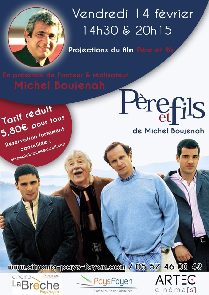 Evènement ! Le complexe du cinéma "La Brèche" à Ste Foy La Grande accueille pour la première fois l'acteur et réalisateur Michel BOUJENAH le vendredi 14 Février 2020 pour son film "Père et Fils". Séances prévues à 14h30 et 20h15 en présence de l'acteur.