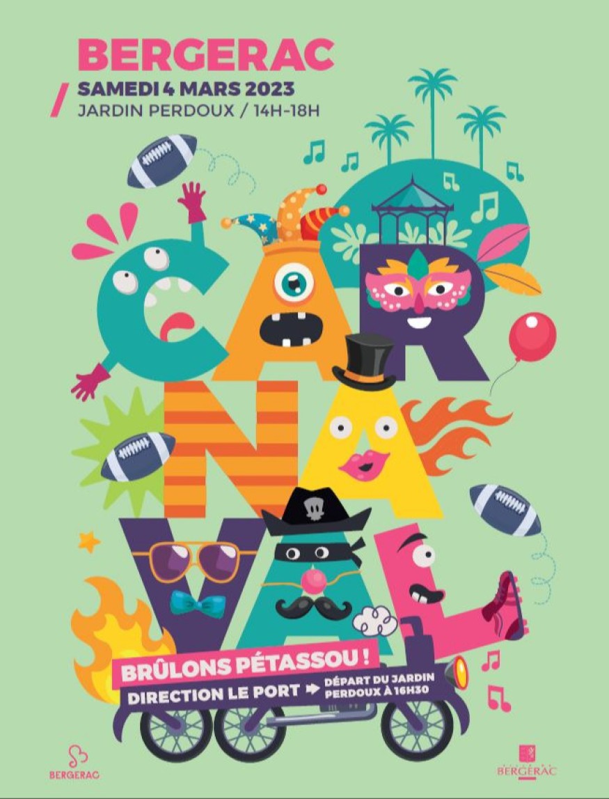 Le Carnaval à Bergerac c'est ce Samedi 04 Mars 2023. Au programme ; Ateliers cirque, maquillage, chamboul’tout, expérience papertoys, jeux autours du chant et de la danse, photoboot, démonstration et initiation de danse, tombola italienne, ateliers d’adresse et de manipulation sur structure gonflable, parcours de motricité sur modules mousse, jeux en bois, mangeurs de balles, confection de ballon de rugby en papier et quizz sur le rugby, atelier créatif pinata rugby…